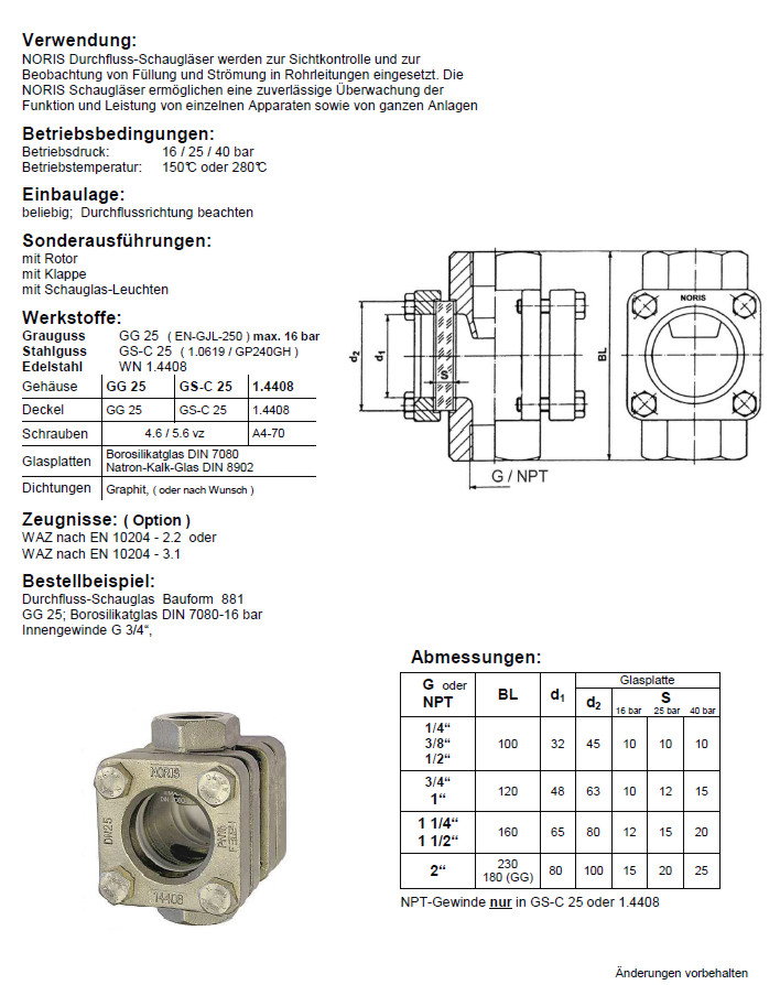 NORIS | Durchfluss Schauglas mit Innengewinde (G oder NPT)