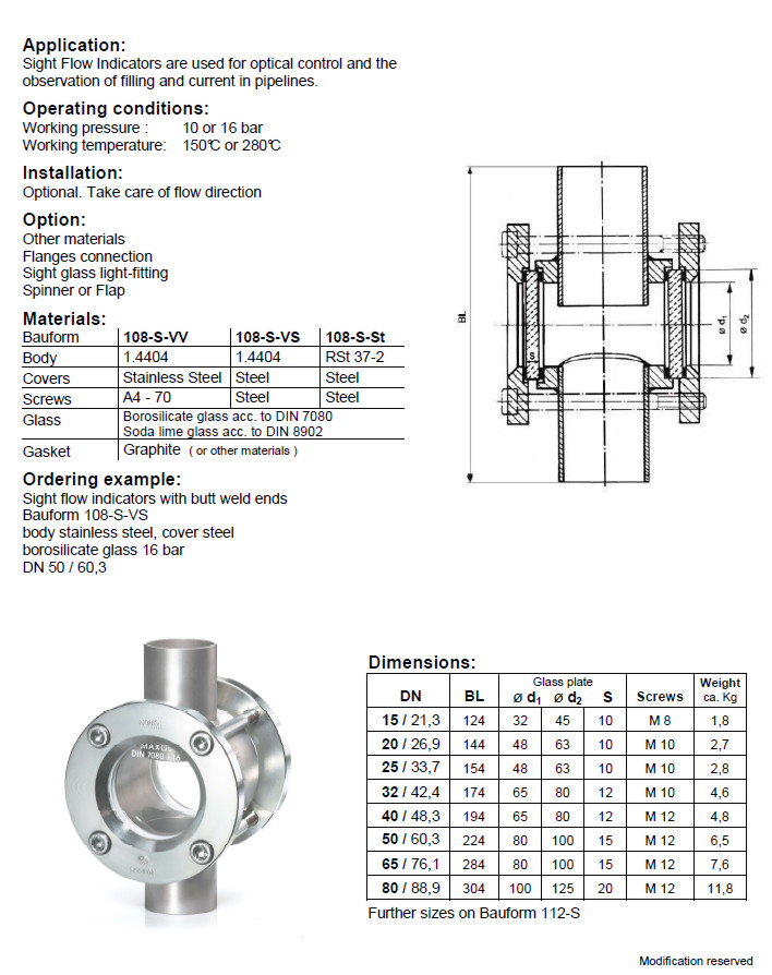 Products > Fittings > sight flow indicators > with butt- or socked-weld ends > Bauform 108-S