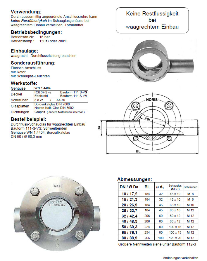 Produkte > Armaturen > Durchfluss Schaugläser > mit Anschweißenden > Bauform 111-S