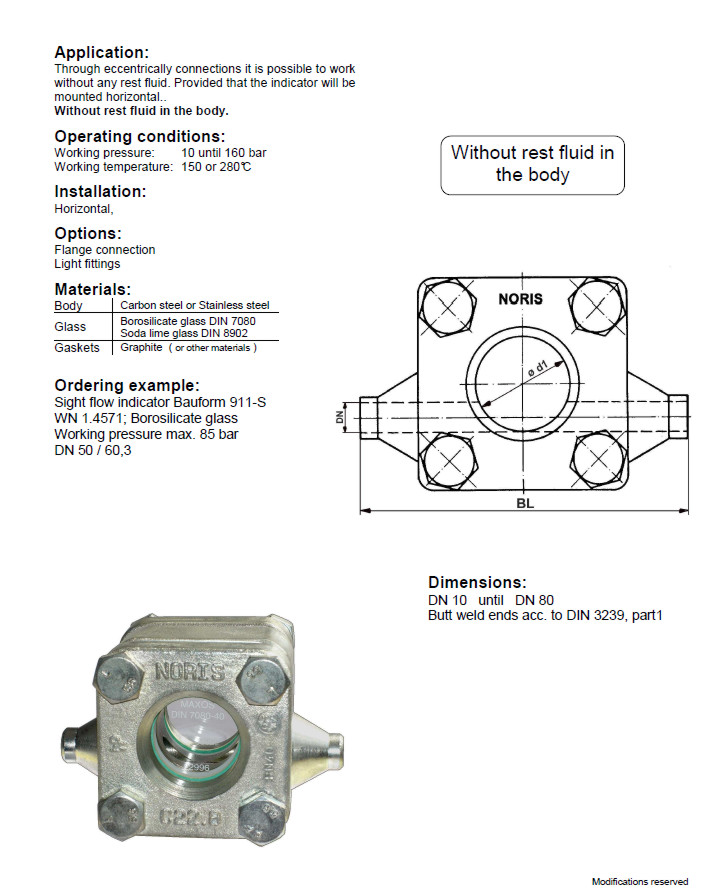 NORIS | sight flow indicator with weld ends without residual fluid for higher pressure